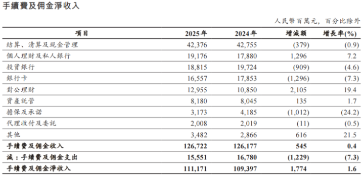 非利息收入方面,2025年该行斥逐非利息收入1662.69亿元,同比增长11.8%,占营业收入20.7%。其中,手续费及佣金净收入1111.71亿元,同比增长1.6%,斥逐了此前贯穿3年下降趋势;其他非利息收益550.98亿元,加多157.74亿元,增长40.1%。