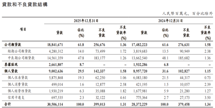 分业务看,2025年末,该行公司类贷款不良率为1.36%,较上年末下降0.22个百分点,但个东谈主贷款不良率为1.58%,较上年末飞腾0.43个百分点。