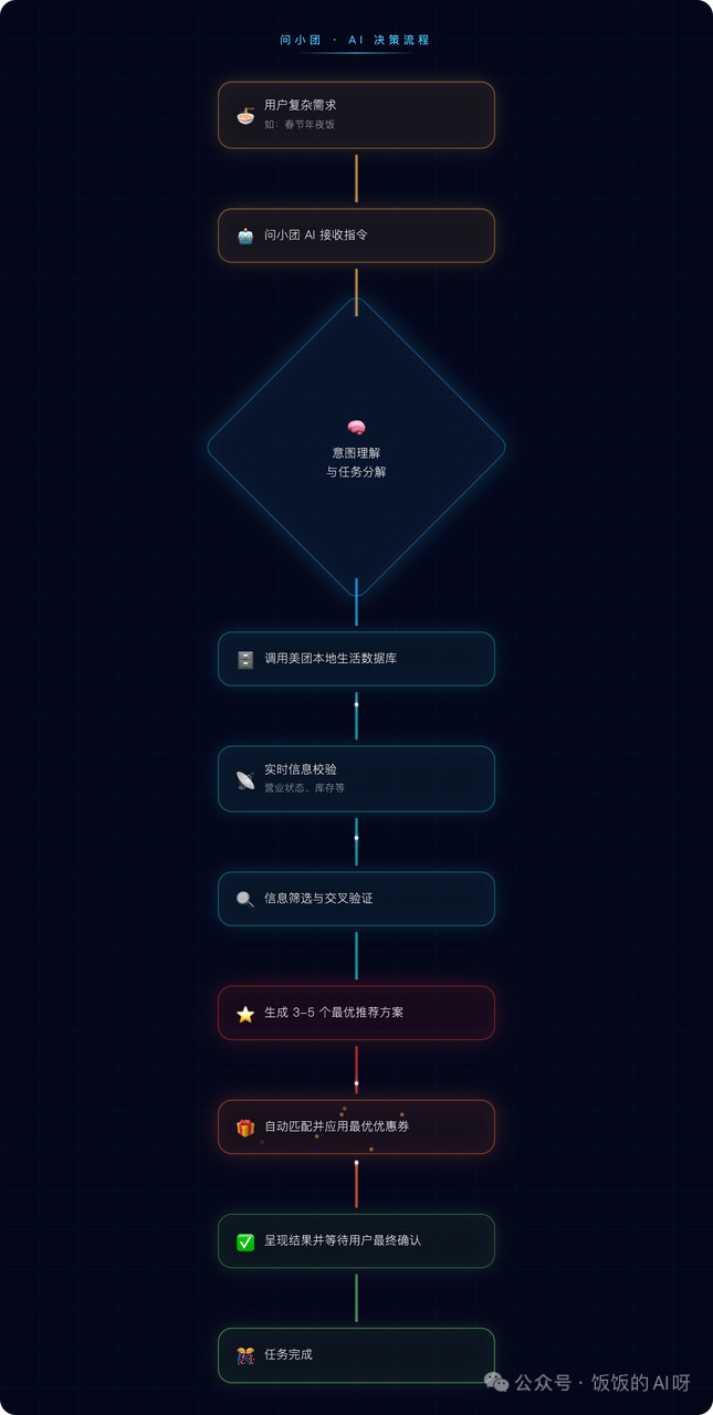 当用户提议“年三十,全家十口东谈主,有小孩,要泊车,订年夜饭”的需求时,问小团给出的不是几十家餐厅列表,而是经过深度筛选后的3-5家最优推选。在信息过载的期间,AI的价值不再是提供更多选项,而是通过提前判断和考据,为用户“压缩聘用”,裁汰决策疲顿。