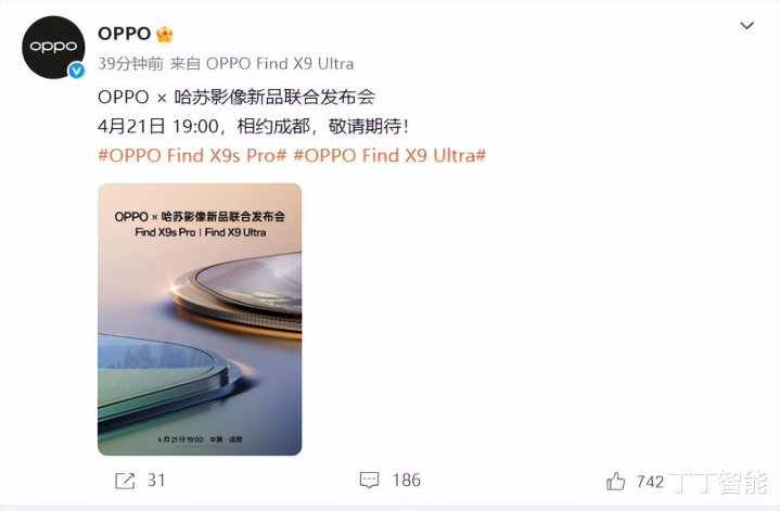 OPPO 官合圭表官宣,OPPO× 哈苏影像新品蛊惑发布会将于4 月 21 日 19:00在成皆举办,届时年度影像旗舰OPPO Find X9s Pro与OPPO Find X9 Ultra将携手登场。