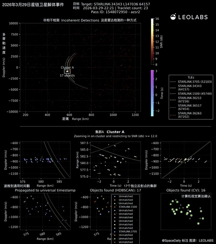 凭证好意思国空间态势感知公司LeoLab的群众雷达鸠合探伤,编号34343的SpaceX星链卫星如故于3月29日解体,生成了不少天外碎屑垃圾。