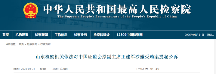 3月31日,最妙手民搜检院官网发布讯息,中国证券监督责罚委员会原党委委员、副主席王建军涉嫌纳贿一案,由国度监察委员会造访驱逐,移送搜检机关审查告状。最妙手民搜检院照章以涉嫌纳贿罪对王建军作出逮捕决定,并指定由山东省潍坊市东说念主民搜检院审查告状。近日,潍坊市东说念主民搜检院已向潍坊市中级东说念主民法院拿起公诉。