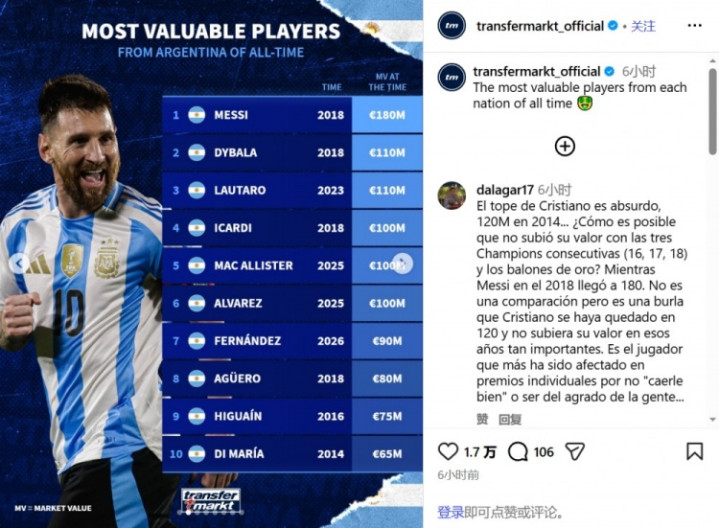 188BET 阿根廷历史身价名次: 梅西1.8亿欧第一, 恩佐第7迪马利亚第10