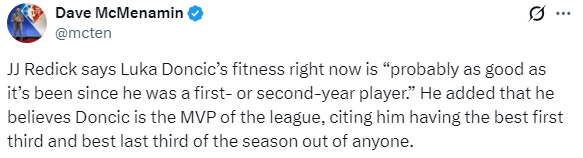 雷迪克肯定东契奇即是定约里的MVP,赞美东契奇在前1/3赛季和后1/3赛季的弘扬是定约里最棒的。