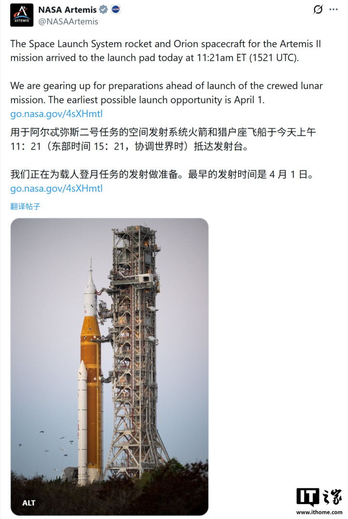 金宝博 好意思国载东说念主绕月火箭重返辐射台: 征战露出故障, 对准 4 月 1 日升起
