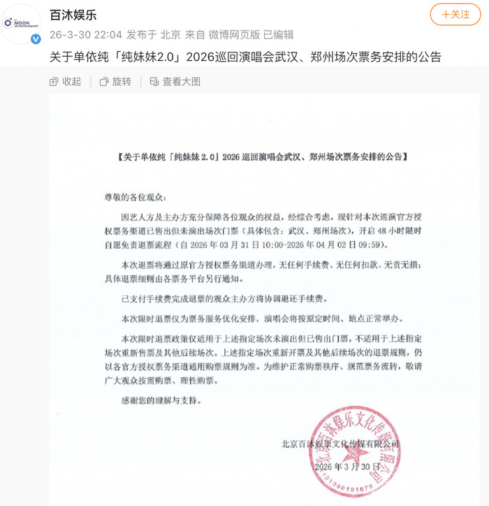 3月30日深夜,单依纯2026巡演的垄断方北京百沐文娱文化传媒有限公司(以下简称“百沐文娱”)发布公告称,经综认为议,针对单依纯这次巡回演唱会官方授权票务渠谈已售出但未献技场次门票(包含武汉、郑州场次),开启48小时限时自觉免责退票历程。