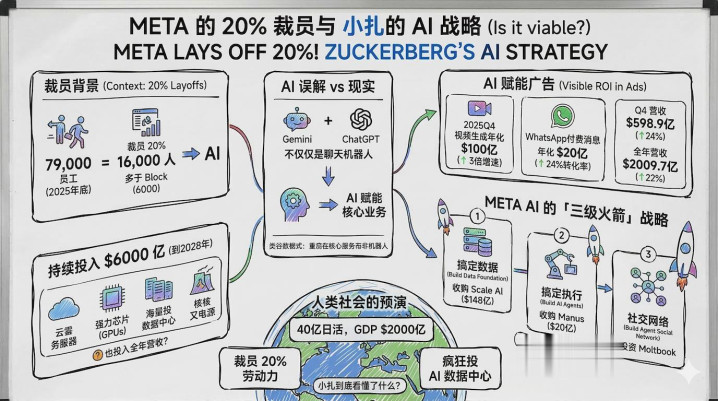 Meta通告裁人20%,截至2025年底,共有79,000名职工,裁人20%,即是16,000个岗亭。比较之下,前不久的Block裁人40%大略是6000个岗亭,Meta裁人比Block多了10000东说念主。